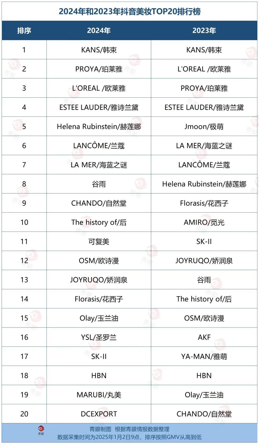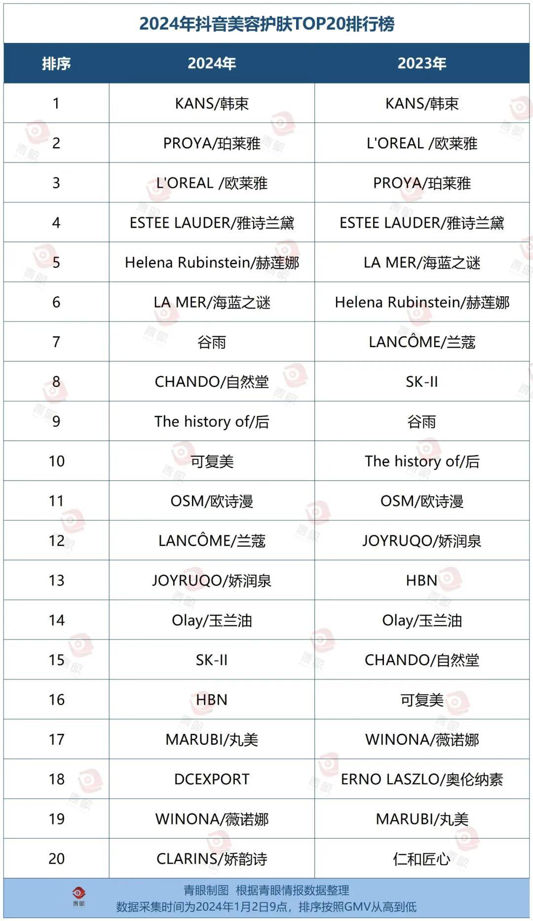 另值得关注的是,抖音美容护肤榜TOP20中处于尾部的品牌变化较大。青眼注意到,抖音美容护肤榜单中第15至20名的品牌变化明显。2023年入榜的奥伦纳素和仁和匠心在2024年均未上榜,取而代之的是DCEXPORT和娇韵诗。对比2024年11月来看,C咖和HERBMODA两个品牌也未在12月上榜。由此可见,处于抖音美容护肤榜尾部的竞争尤为激烈,上榜品牌更迭频繁。若想要稳定在抖音美妆TOP20品牌之列,品牌无疑需要持续提升产品品质和创新能力,以及加大市场推广力度。