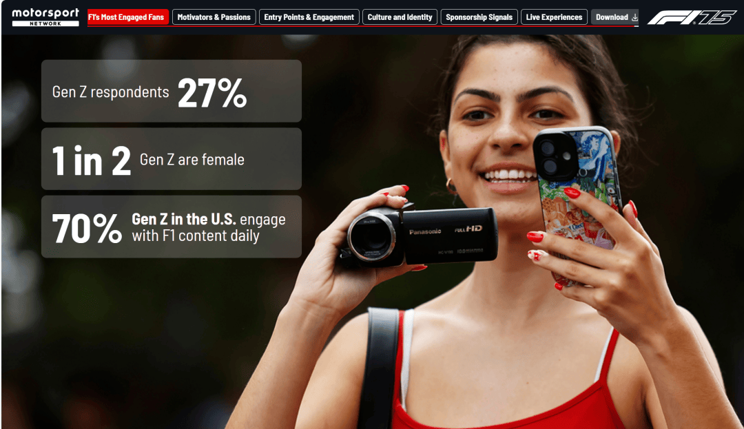 2022年,随着TikTok的兴起及Netflix网飞拍摄的F1纪录片《极速求生》(Drive To Survive)系列的成功——该系列通过多集内容展现了F1大奖赛的幕后故事——F1首席执行官斯特凡诺·多梅尼卡利注意到女性观众对F1的兴趣呈现爆发式增长,在整体观众中的占比更是攀升至约40%。如今,女性粉丝仍占F1全球总观众人数的40%左右,其中主力军为Z世代女性。根据2025年全球F1调查,超过70%的Z世代粉丝每日都会搜索或接触F1相关内容。