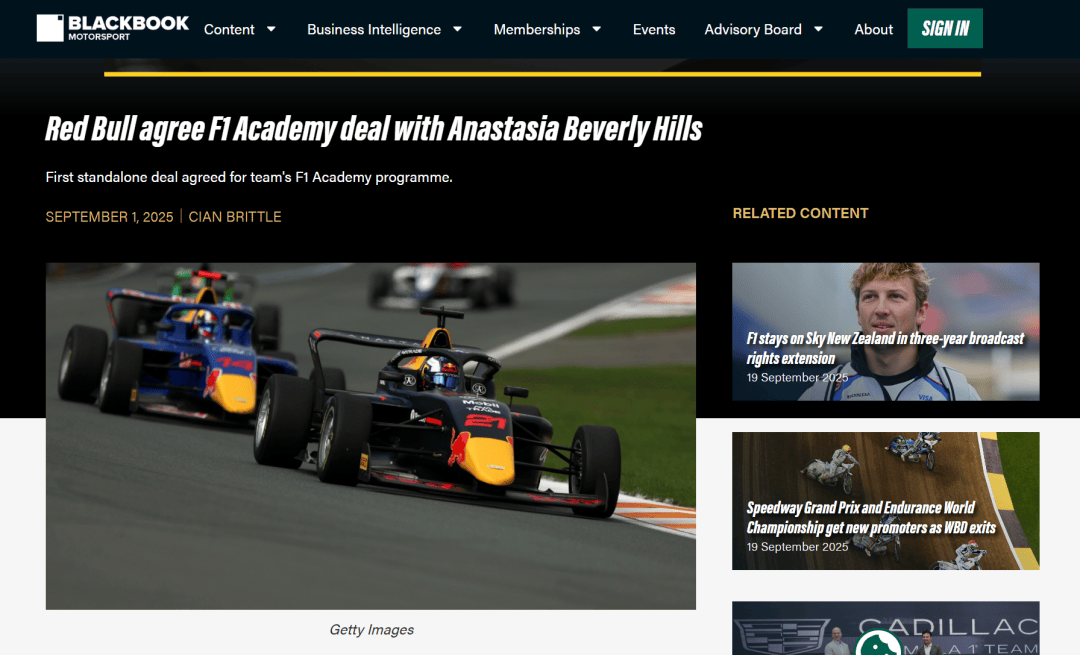 紧随夏洛特蒂铂丽之后,专业美发品牌威娜(Wella Professionals)今年也步入赛道,与F1学院达成长期合作伙伴关系,并推出了印有该品牌经典美人鱼LOGO的亮红色赛车及赛车服;威廉姆斯车队(Williams Racing)车手卡洛斯·塞恩斯(Carlos Sainz)则在今年初被选为巴黎欧莱雅Elvive头发护理系列的全球品牌大使;而Anastasia Beverly Hills则成为最新一个加入围场的美妆品牌,它宣布与红牛F1学院车队达成合作,该合作的具体内容将于2025年F1荷兰大奖赛期间正式揭幕。